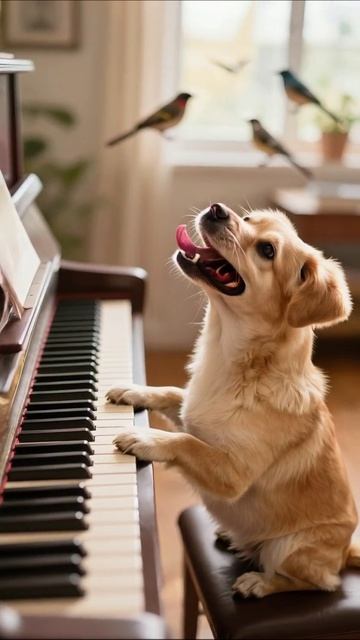 Собака играет на пианино в компании птиц #собака #музыка #домашниеживотные